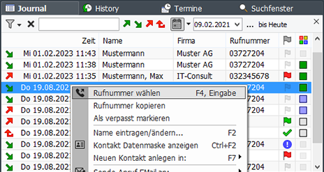Das Journal dient der Protokollierung aller Anrufe u.a. mit Zeitpunkt, Name, Rufnummer und Gesprächsdauer. Dabei werden verpasste Anrufe hervorgehoben angezeigt. Einzelne Einträge können mit einem Status und einer Kategorie markiert werden.