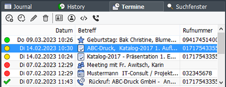 Call logging in the call journalThe journal is used to log all calls, inter alia, with date, name, phone number and call duration. Missed calls are highlighted. Individual entries can be marked with a status and a category. The integrated search filter bar allows the journal entries to be filtered by name, phone number, time frame and call status (incoming, outgoing, connected and missed). Offline-Journal in combination with CTI ServerWhen the client PC is switched off, calls are recorded in a server-based offline journal and transferred with next login.