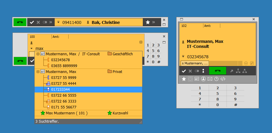 CTI Client in "Classic" design with alternative arrangement of the tab windows.