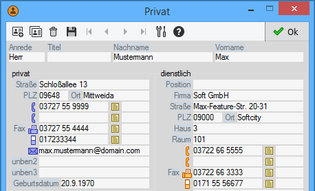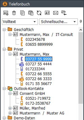 The name of the folders entries are build by columns which are marked as name columns. Mostly those ones are name and first name. If no name or first name is entered, the company name is shown even if the column with company name was not marked as a name column.The third level shows all phone numbers for the record if more than one exists. If the record contains only one phone number, this is shown next to the telephone receiver as soon as the record was selected.