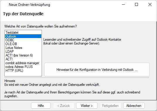 Phonebook > New > New Folder Linking > Outlook, ODBC, ....